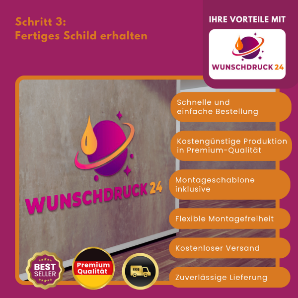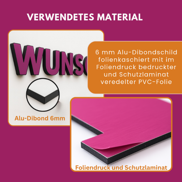 Alle Schilder bestehen aus 6 mm starkem Alu-Dibond – stabil, wetterfest, langlebig und mit Premium-Optik für Innen und Außen.